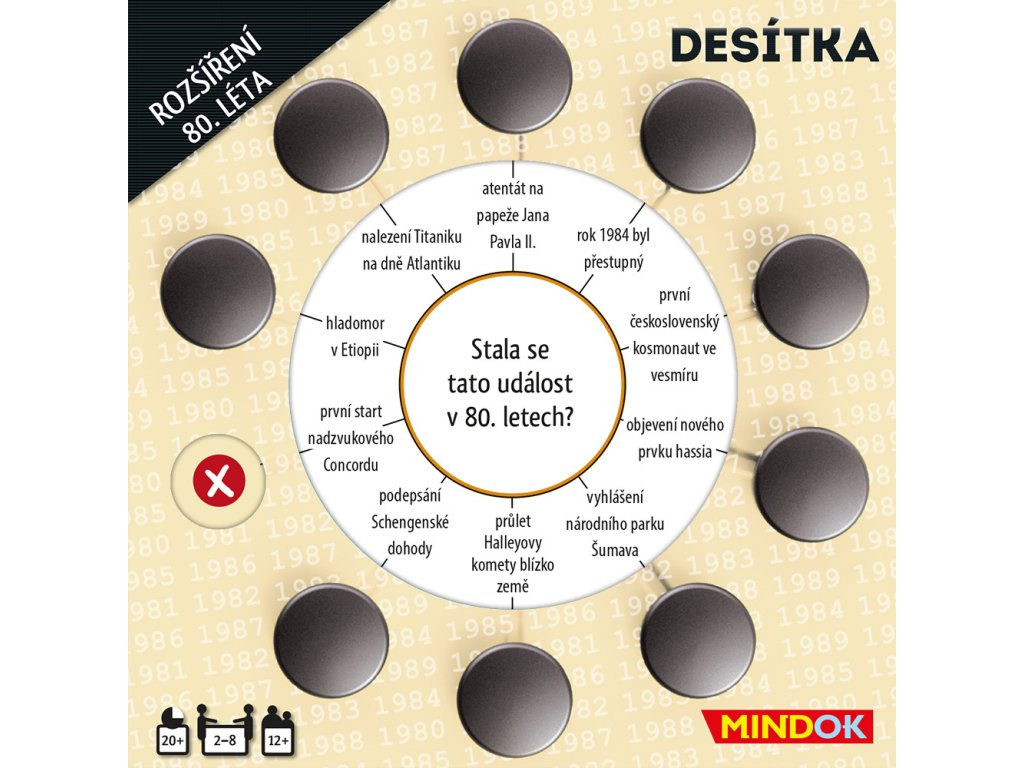 V tomto rozšíření najdete 50 nových oboustranných karet! 100 nových okruhů, 1000 nových otázek a odpovědí týkajících se 80. let 20. století.