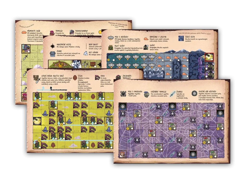 Hobit: Cesta tam a zase zpátky je zakreslovací hra zasazená do populárního románu J.R.R. Tolkiena Hobit. Hráči se v ní vydají na cestu k Osamělé hoře, která je rozdělena do osmi různých kapitol, přičemž každé dobrodružství má své unikátní cíle i podmínky bodování. Cestou budou sbírat suroviny a také se utkávat s nepřáteli, přičemž k tomu všemu budou využívat výsledků hodů kostkami, z nichž si budou vybírat a na základě nich kreslit do speciální příběhové knížky. No když dojdou až nakonec, tak se třeba setkají i s drakem Smaugem!
