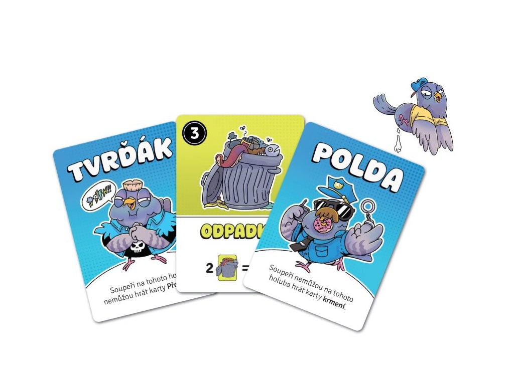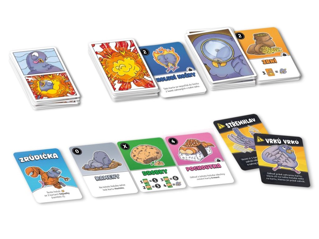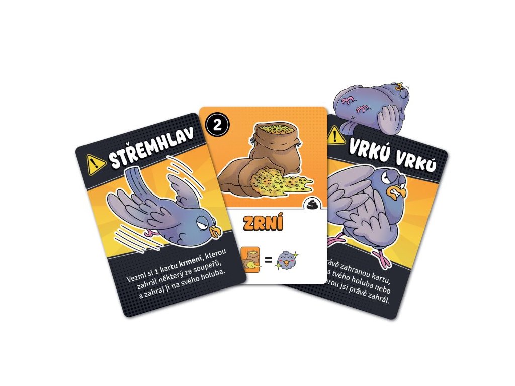Zábavná, svižná a pořádně potrhlá karetní hra, ve které se z kamarádů stanou záludní krmiči holubů. Cílem je nakrmit své vlastní opeřence tak, aby byli šťastní – a zároveň přecpat ty soupeřovy tak, aby jim prostě… bouchli!