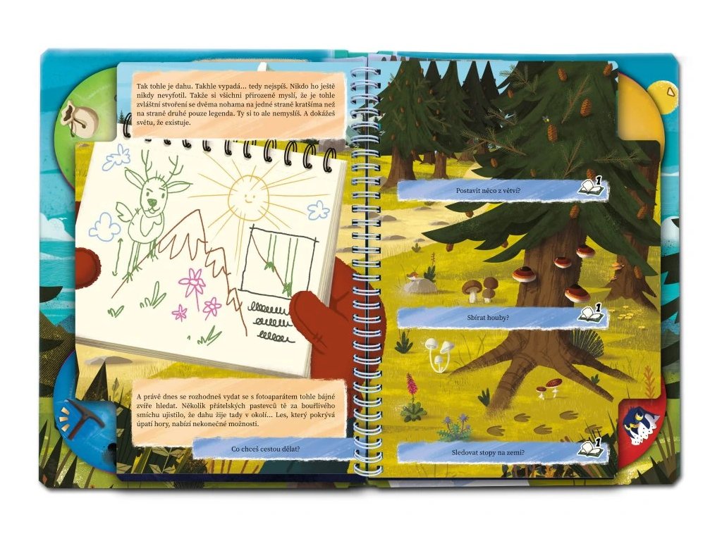 "Tak tohle je dahu. Takhle vypadá… tedy nejspíš. Nikdo ho ještě nikdy nevyfotil. Takže si všichni přirozeně myslí, že je tohle zvláštní stvoření se dvěma nohama na jedné straně kratšíma než na straně druhé pouze legenda. Ty si to ale nemyslíš. A dokážeš světu, že existuje. A právě dnes se rozhodneš vydat se s fotoaparátem tohle bájné zvíře hledat."