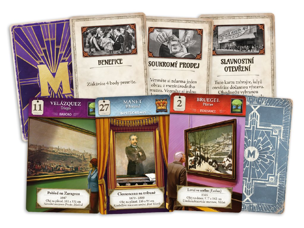 Ujměte se role ctižádostivého kurátora v muzeu umění! Bouřlivá 20. léta byla časem elegance, extravagance a obdivování umění, kdy muzea dychtivým davům ukazovala ty nejslavnější obrazy. Vy se v jednom z těchto muzeí ujmete role kurátora a budete pověřeni sestavením sbírky umění, jakou svět ještě neviděl! Zaplňte galerie svého muzea kartami obrazů a vytvořte z nich sbírky se stejným tématem nebo ze stejného období. Čím větší vaše sbírka bude, tím víc bodů prestiže za ni na konci hry dostanete. Vyměňujte drahocenná umělecká díla s mezinárodními muzei, nakloňte si vlivné mecenáše a připravte dočasné výstavy svých nejlepších sbírek, abyste získali další body. Hráč, který bude mít na konci hry nejvíc prestiže, se stane vítězem! Museum Pictura je moderní společenská hra o vytváření sbírek, kterou bude snadné se naučit, ale stát se v ní mistrem bude mnohem těžší. Museum Pictura kromě výzvy nabízí i 180 individuálně ilustrovaných karet obrazů. Každá karta vám představí slavné umělecké dílo a přesné údaje o každém z nich. OBSAH BALENÍ: