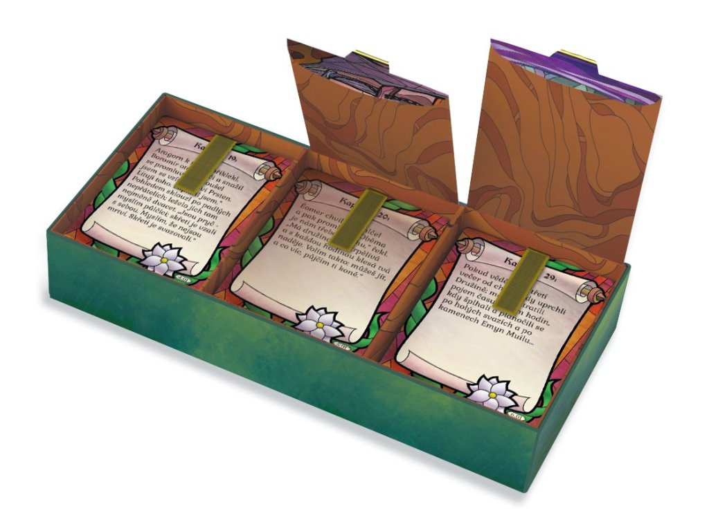 - Tematické karty, ilustrace i práce s Tolkienovým světem vytvářejí silnou atmosféru druhého dílu trilogie.