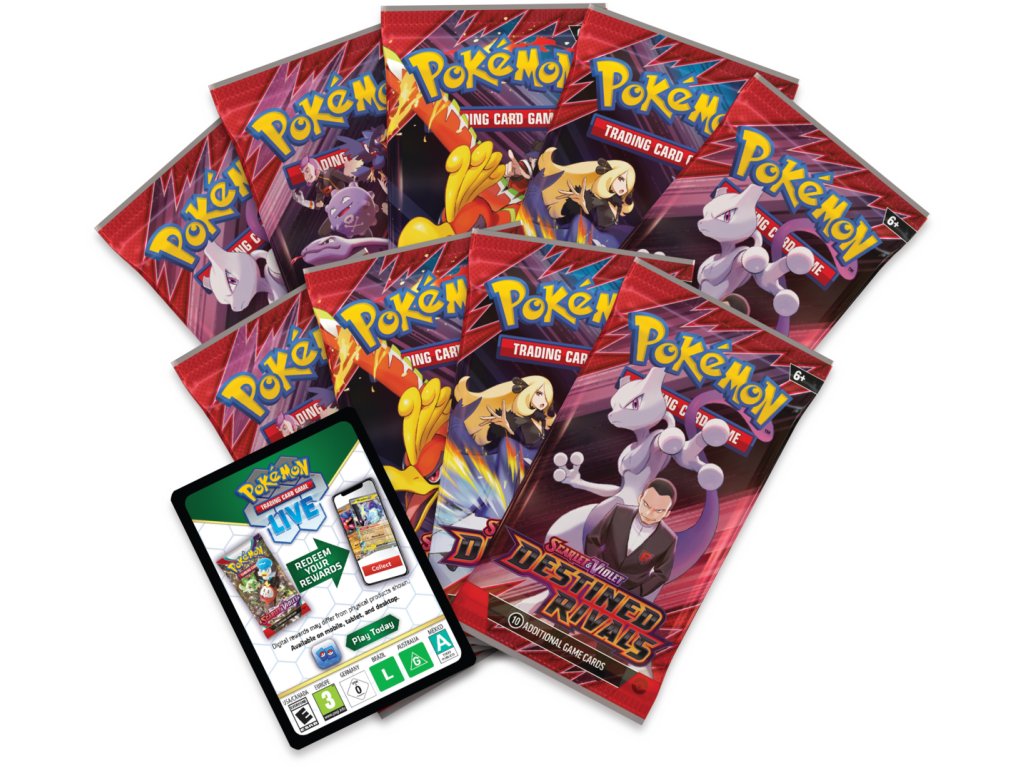 Elite Trainer Box Destnined Rivals je balení 9 balíčků Pokémon karet, 1 promo karty, obalů, kostek a oddělovačů. Každý balíček obsahuje 10 karet. Celkově tak získáte 90 Pokémon karet.