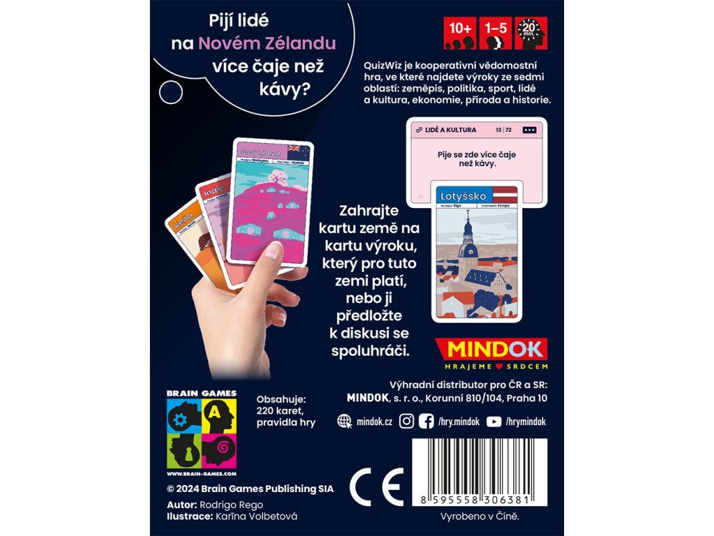 Quiz Wiz je kooperativní vědomostní hra, která vás provede napříč kontinenty, historií i kulturou. Namísto soupeření se tentokrát všichni hráči spojí u jednoho stolu, aby společně přiřazovali karty zemí ke správným faktickým výrokům. Klíčem k úspěchu je vzájemná domluva nad historickými souvislostmi či zeměpisnými fakty, aniž byste však přímo prozradili, jaké karty států držíte v ruce.