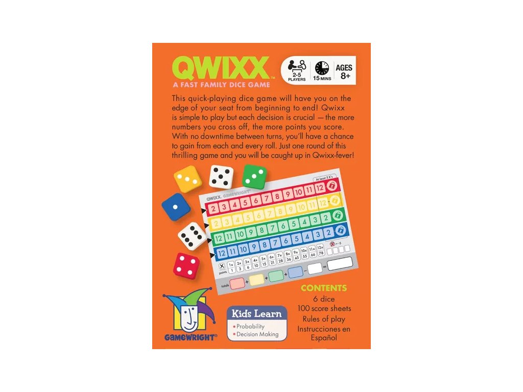 Qwixx je rychlá a svižná kostková hra. Jeden hráč hodí kostkami a všichni mohou v tu chvíli využít jeho hod a zakřížkovat si čísla na svých kartách. Je ale třeba pečlivě zvážit, kdy které číslo označit, abyste nasbírali co největší počet křížků, za které na konci hry dostanete body. Jednoduchá pravidla se naučíte během dvou minut a poté si užijete velkou spoustu zábavy s kostkami.