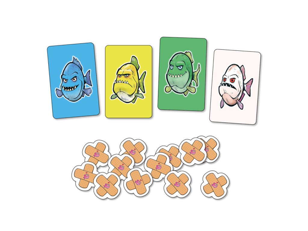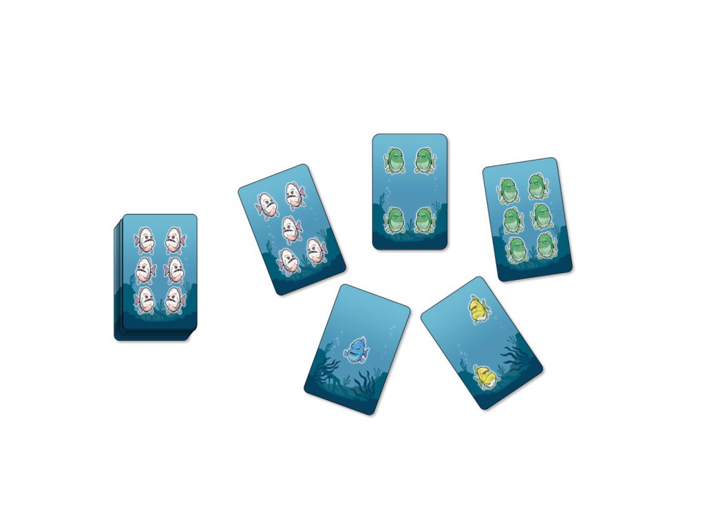 Žravé rybky jsou karetní hra s piraněmi pro malé i velké hráče! Hráč ve svém tahu položí oboustrannou kartu jednou ze dvou stran nahoru a poté otočí všechny karty stejné barvy na druhou stranu.